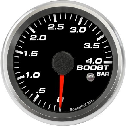 Speedhut 2-5/8" Boost Gauge 0-4bar Metric (w/ warning) Designed for the discriminating custom car builder looking for the ultimate in custom quality, easy to read 2-5/8 in. electronic Boost gauge. An internal microprocessor controls the needle movement through a digital stepper motor. The high torque of the stepper motor ensures accurate pointer movement without vibration in all race conditions. Military/medical grade electronic (.5-4.5v) pressure transducer(sensor) is included with the gauge for highest accuracy. Setable warning LED allows you to set both low and high warning points. Peak recall memory shows maximum peak AND low peak that occured. A super thin (easy for gauge pods) composite carbon case design allows easy mounting in tight locations. Can be mounted in 2-1/16 or 2-5/8 gauge hole. Can be mounted in 2-1/16 gauge pod. Anodized solid Aluminum bezel! A unique Spin lock ring is included for ease of installation and a total custom look.